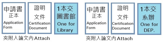 應屆畢業生如有紙本學位論文延後公開之需求,請登入「紙本論文延後公開申請系統」填寫資料,並線上列印2份申請書、佐附相關證明文件,依申請書所示順序核章後,分別夾附交至「系辦」與「圖書館」的紙本論文內(勿與論文裝訂、勿附於電子論文內)。 列印2張申請書並佐附證明文件或是聲明文件(2份), 依序核章完畢後,分別夾附至「系辦」與「圖書館」的紙本論文內