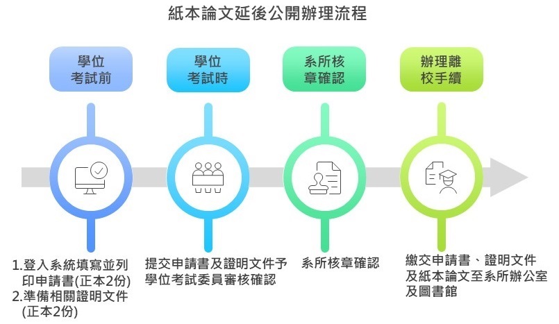 紙本論文延後公開:應於學位考試前「紙本論文延後公開申請系統」填寫列印申請書(正本2份),且須根據延後原因檢附相關證明,於學位考試時,供考試委員審核簽名,申請書須完整簽核。